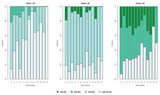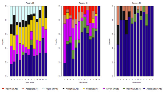 Figure 4 shows the evolution of these proposals throughout the games. We can see that for agents with power 20, the proportion of the grand coalition being proposed gradually rises. This may be an indication that these low-powered agents learn and comprehend that proposing the grand coalition will likely include them in the final coalition. The trend of increasing the proportion of grand coalition proposals is also true for agents with 35 and 45, although statistical tests show that the increase is milder for Agent 35 (see the logit model in Table A4). This finding is consistent with the results in Table 4, where we note that for Agent 35, proposing the two-person coalition with the lower-powered agent remains an empirical best response that provides him with the highest expected pay-off among all his proposal strategies. On the other hand, for Agent 45 we can see that in late games the gap in expected pay-off from proposing the two-person coalition with Agent 20 and proposing the grand coalition becomes narrower. For Agent 45, the expected pay-off of proposing vs. is $2.81 vs. $1.05 in early games and $2.28 vs. $1.65 in late games. For Agent 20, the expected pay-off from proposing the grand coalition increases from $0.59 in early games to $0.66 in late games (Appendix B Table A2 and Table A3).