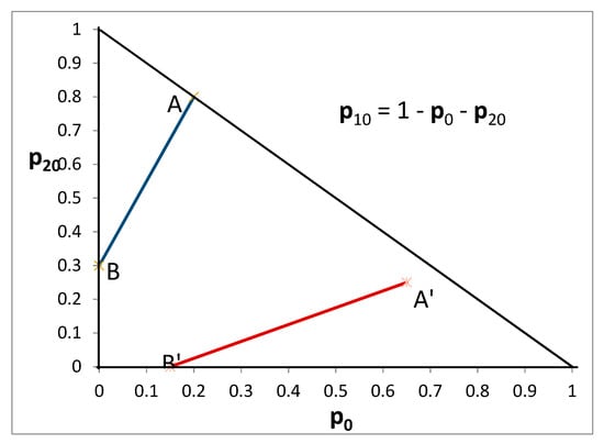 The HO dataset contains 100 unique binary choice tasks.11 Each task was a choice between two lotteries with three prizes drawn from the set {0£, 10£, 20£, 30£}. A crucial design factor was the ratio of (i) the difference between the probability of the high outcome for lottery A and the probability of the high outcome for lottery B to (ii) the difference between the probability of the low outcome for lottery A and the probability of the low outcome for lottery B. It is insightful to represent this choice paradigm in a Machina (1982) [18] triangle, as shown in Figure 1 for the case when the prizes are {0£, 10£, 20£}.