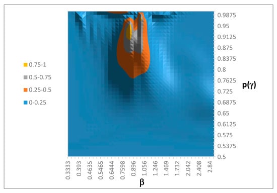 Indeed, we find evidence for multiple modes. A grid point θ is declared a mode if and only if it has the highest value of g* in a 7 × 7 × 7 cube of nearest neighbors of θ in the grid. The most prominent mode is at p(γ) = 0.999, ρ = 0.85, and β = 0.681. The next most prominent mode is at p(γ) = 0.975, ρ = 0.45, and β = 1.00. The third most prominent mode is at p(γ) = 0.999, ρ = 0.85, and β = 1.47. Numerous other modes exist but are best described as shallow bumps.