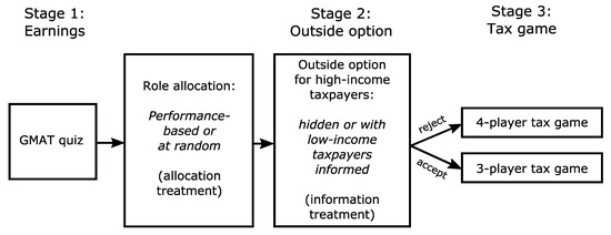 At the same time, a widely held normative belief is that those who can afford to carry a higher share of the tax burden should do so.1 Such equity principles may be in conflict with the logic of lowering taxes on mobile high-income taxpayers. The OECD report, for instance, states that ‘tax concessions will create equity concerns by treating differently high-skilled and less-skilled workers’ ([9], p. 124).2 Equity perceptions, in turn, are believed to influence tax compliance [10,11], raising the possibility that compliance is adversely affected by a preferential tax treatment of high-income taxpayers. In what follows, we generically refer to the possibility of legally avoiding taxation (e.g., by relocating abroad) as ‘outside option’.3 Because reliable information on tax compliance and equity perceptions is difficult to obtain simultaneously with exogenous variation in outside options, we conducted a laboratory experiment.