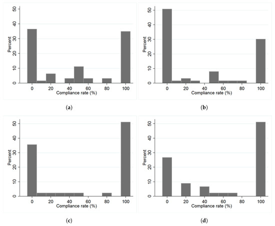 Distribution of low-income taxpayers’ compliance choices by treatment. Only the 216 observations of low-income taxpayers in groups of four are displayed. PBA = Performance-based allocation, RA = Random allocation. (a) PBA, without information (N = 63); (b) PBA, with information (N = 63); (c) RA, without information (N = 45); (d) RA, with information (N = 45).