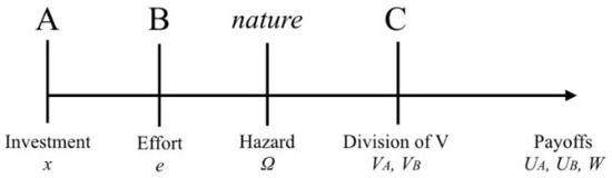 The first-order condition of the utility function (2) will lead to a 50–50 distribution. This solution is also consistent with the literature on inequality aversion [27]. It is worth noting that this equal division of the total revenue does not incorporate the cost of effort. There are two particular reasons for that. First, even if the expected value of Ω is zero, in each round, player C does not know the realization of Ω. Thus, the real value of player B’s effort is private information; then, it is impossible to discount the real cost of effort for a particular realization. Second, the decision-maker is not necessarily interested in being fair, but in being perceived as fair. Hence, the most salient way to look like a fair person is making a 50–50 division of the total pie.