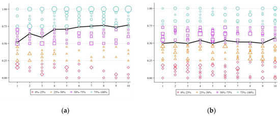 In the FREE treatment, any external factor that might influence player C’s distribution decision was controlled for. Subjects in the role of player A invested, on average, 69% of their endowment (see Table 1). This investment suggests that participants in the role of player A did not sufficiently attempt to achieve the highest project value. However, using Pearson’s correlation test,7 it can be observed that player A’s investment increases over time (r = 0.237, n = 340). Figure 2a shows that the frequency of high levels of investment, i.e., above 75%, increases over time, while the frequency of low levels of investment, i.e., below 25%, decreases (see circles and diamonds respectively, in Figure 2a). Despite this increase in high levels of investment, the average investment in the last round is significantly lower than the one predicted in equilibrium.