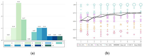 In the AD treatment, the effect of player B sending a message to player C, where he suggests a particular share of the project, was studied. Hypothesis 2 predicts that subjects in the role of player B will make use of the communication channel, influencing player C’s allocation in favor of player B compared with that in the FREE treatment. The data show that when considering all 290 interactions (29 groups over 10 periods), 178 (69%) did not include any message. To study in more depth the use of the communication channel, a score variable that counts how many times a player B sends a suggestion to player C over the 10 periods was created. Therefore, this score takes values between 0 and 10. Figure 3a presents a histogram for this advice score. It can be observed that 62% of the participants sent, at most, three messages (see Figure 3a). Thus, the evidence provides no support for the prediction of Hypothesis 2 regarding the use of messages. The little use of the communication channel can be explained by the fact that player C does not respond to suggestions. In period 1, about 60% of the participants sent messages, but after that, the percentage declined significantly.