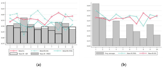 (a) Player B’s shares and beliefs in AD and FREE, (b) frequency of messages sent in AD. The solid (dashed) line portrays the mean values per period for player B who sent a message in AD.