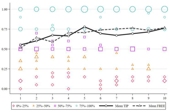 In the TIP, the average investment is seemingly similar to that in FREE, as presented in Table 1. Indeed, comparing Figure 2a and Figure 5, one can see that the levels of investment are similar. However, after the period and demographics are controlled for, the investment in TIP is slightly higher than in FREE (p = 0.033), as is presented in regression (1) in Table A4 of Appendix D. Regression (2) in Table A4 of Appendix D shows that the level of effort is not significantly different between TIP and FREE.