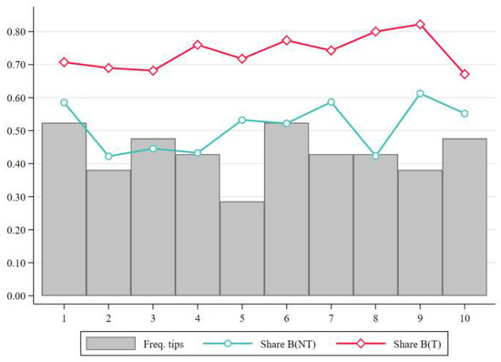As mentioned in the experimental design section, arguably, the influence of a tip is that it creates in player C a willingness to favor player B in order to receive said tip. As can be seen in the coefficient of TIP in models (1) and (2) of Table 3, in TIP, player B receives 0.137 percentage points more than player A after controlling for several variables, including player B’s signal of effort. This result suggests that the possibility of receiving tips corrupts the judgment of player C in favor of the potential tipper. That is, the bias toward player B is the result of the assumption that player B will return some of the money allocated, thereby harming player A. To see this point, the players divided into those who sent a tip (T) and those who did not send a tip (NT). Figure 6 shows that player C’s distribution choices significantly favor player B over player A in the T group, while the allocation to B is around 0.5 in the NT group. In model (5) of Table A4 of Appendix D, a panel Probit model was used, in which the dependent variable is whether player B decides to send a tip or not. In this regression, the coefficient of Share to B is significant (p < 0.05), which suggests that the allocation of a higher share to player B triggers a tip from player B to player C.