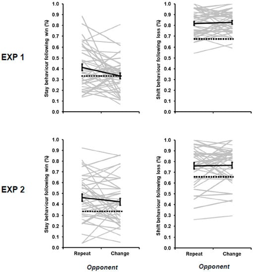 Individual (grey) and group (black) data for win–stay and lose–shift proportions across opponent repeat and opponent change trial pairs in Experiments 1 and 2. Error bars represent standard error. Dotted line represents proportion of win–stay (0.333) and lose–shift (0.666) behavior expected from unpredictable performance.