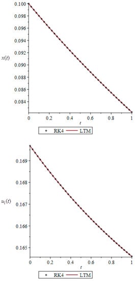 The numerical results for optimal payoff functionals and with different values of are shown in Table 1 and compared with RK4. The graphs of approximate solutions for open-loop Nash equilibrium for are given in Figure 1.