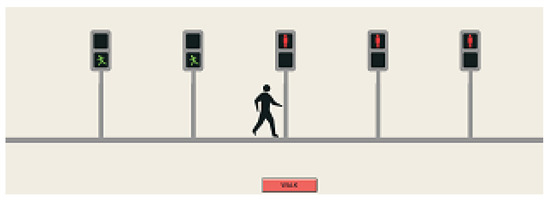 In part one of the experiment each subject participated in the rule-following task. The rule- following task was designed to capture individual sensitivity to social norms or rule-following [8]. In the task, each subject had the ability to control a figure that walked from the left to the right side of the screen. As the figure moved across the screen, the figure stopped at a traffic light automatically. In the task, there were a total of five traffic lights. At any time, subjects were aware that they could begin walking again by pressing the walk button. The traffic light was red but after five seconds the light would turn green. Similar to Ridinger [9], subjects started the rule-following task with $7 and were told that for each second they spent on the task they would loose $0.07.1 If subjects did not wait at any lights, then it would take total of 24 s to reach the end of the screen. In that case, subjects that did not wait at any lights would loose at least $1.68. Subjects who chose to wait the entire five seconds at each light lost $3.43. Following Kimbrough and Vostroknutov [8], subjects were told “The rule is to wait at each stop light until it turns green.” A screenshot of the rule-following task can be seen in Figure 1.2