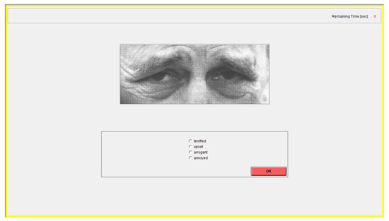In part II, subjects completed the RMET [25]. The RMET is a measure of affective ToM and consists of a series of 36 individual pictures of the area around a person’s eyes. Each photograph is accompanied by four words (see Figure 2). Subjects chose the word that best describes what the person is thinking or feeling. Each question was answered without feedback. Subjects were provided with a printed handout of word definitions for all the words used in the task. The RMET has been shown to be a consistent measure of affective ToM ability and used in wide range of studies [25,26,28,39,40]. Performance on the RMET has been shown to vary due to age [41], gender [28], intelligence [42], and culture [43]. Prior work has show that controlling for these factors is important when using the RMET measure [26].