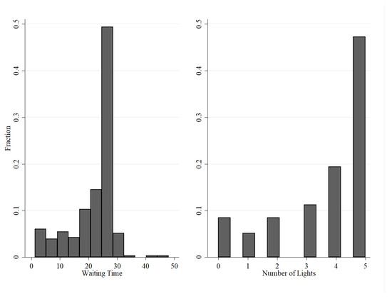 Waiting Time is equal to the total time that subjects waited at each light. Prior research has used waiting time as the measure of the propensity to follow rules [8,9]. The use of waiting time allows for a direct comparison to prior studies using the rule-following task. One potential drawback of the waiting time measure is that it may be influenced by reaction times and these reaction times may introduce noise unrelated to rule-following behavior. To control for this, analysis is also conducted using the variable Number of Lights. Number of Lights is equal to the number of lights that subjects waited at until the light turned green. In essence, the variable measures the number of times subjects followed the rule. Figure 3 shows plots histograms for both the Waiting Time and Number of Lights measures. The distribution of the waiting time measure is similar to prior studies [8,9].