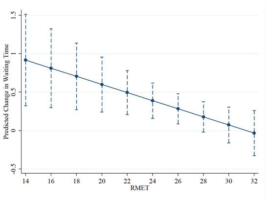 Marginal effects of change in shame negative-self-evaluation (shame-NSE) on waiting time at different RMET scores. Note: This figure uses the regression results from column (8) in Table 3 which included the interaction variable Shame-NSE X RMET. Marginal effects of a unit change of Shame-NSE on Waiting time was calculated by taking the derivative with respect to Shame-NSE and estimating this effect at different RMET Scores. Dashed lines indicate 95% Confidence Intervals.