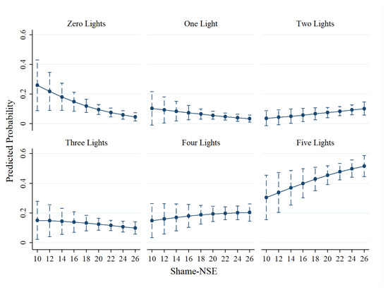 Predicted probability of number of lights by shame-NSE score. Note: This figure uses the multinomial logit regression results from Table A4. Dashed lines indicate 95% Confidence Intervals.