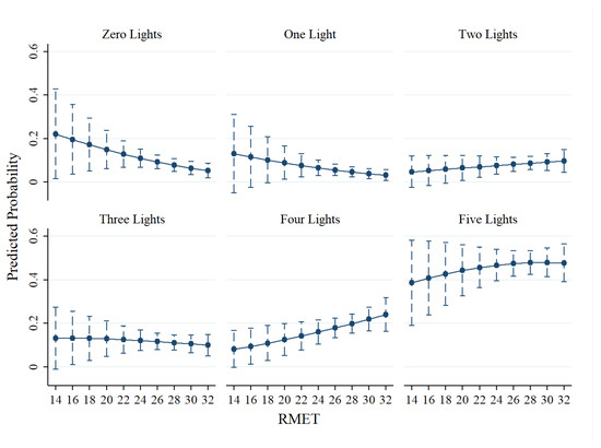 Predicted probability of number of lights by RMET score with 95% confidence intervals. Note: This figure uses the multinomial logit regression results from Table A6. Dashed lines indicate 95% Confidence Intervals.