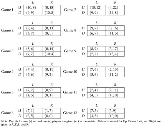 All of the games investigated are of the 2 × 2 form, as shown in Figure 1. The experiments from these games were collected by Selten and Chmura [] and discussed in Chmura et al. []. Chmura et al. [] investigate a series of learning models and determine which rules characterize individual and aggregate performance better. They find that self-tuning EWA fit the data best yet impulse-matching learning also fit the data well. The twelve 2 × 2 games include both constant sum and non-constant sum games.