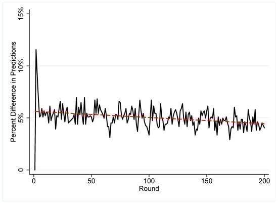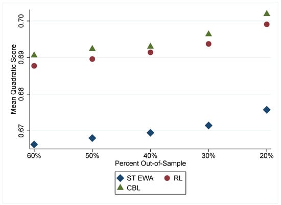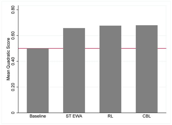 To fit the learning models to data, we estimate Equation (2) for CBL, Equation (5) for RL, and Equation (6) for self-tuning EWA. All of the learning algorithms use the stochastic logit choice rule in Equation (12). In Figure 2, we report the mean quadratic score by the learning models discussed in the previous section across all 12 experimental games. We find when using in-sample measures between the learning models that CBL fits best, RL fits second best, and self-tuning EWA fits third best.13 RL performs about as well as CBL across these experimental games. As expected, each learning model outperforms a baseline benchmark of random choice (i.e., a mean quadratic score of 0.5). Note that Chmura et al. [] also find that self-tuning EWA and a selection of other simple learning models out-perform random choice, but they found self-tuning EWA was the best performing learning model in predicting individual choice with these data.14