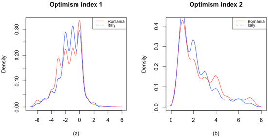 The results also show that in the Romanian case higher education is related to lower levels of optimism (W = 117340, p-value = 1.098 × 10−5 for index 1, and W = 110986, p-value = 1.01 × 10−8 for index 2), so H2b is rejected. The Italian case is different, showing no differences in optimism level by education regardless the index, so H2b is supported.