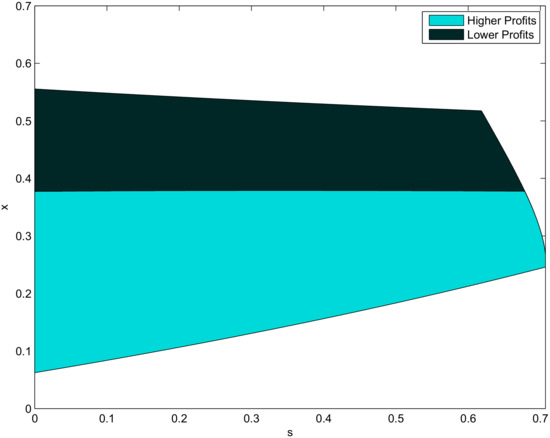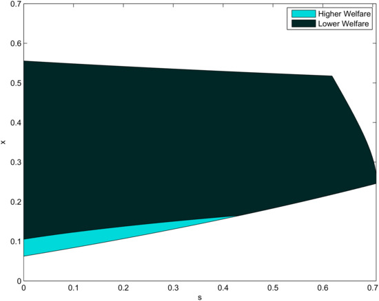 Values of cost differences and overconfidence for which there exists a cost-dependent equilibrium. The shaded area includes all the values of cost differences—captured by the parameter x—and overconfidence—captured by the parameter s—for which there exists a cost-dependent equilibrium.