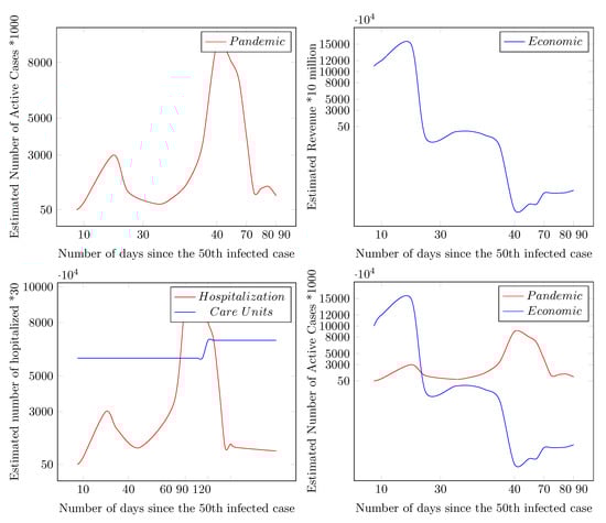 - Effect of mobility on the propagation COVID-19: The movement and migration of people between locations add an additional difficulty in estimating the infectivity as each infected person may be moved, flown to another city, state, country or continent. Some estimations have been proposed by using contact-tracing or mobile tracking of the path of the each infected person and all its possible contacts using mobile networks and recognition. However, these estimations on COVID-19 remain limited at a global level [,,,]. The work [] focuses on a Global Epidemic and Mobility model that integrates sociodemographic and population mobility data set in a spatially structured stochastic disease approach to simulate the spread of epidemics at the worldwide scale. In contrast to [], we integrate a data-driven optimization setup for authorities and for individuals as well.