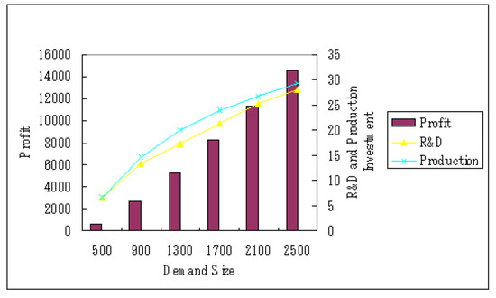 Figure 3 demonstrates the results of sensitivity analysis in the value of market size. Greater market size means relatively strong demand, which yields higher leader’s accumulated profit, and higher optimal R&D and manufacturing investments. It is basically consistent with the expectations. This analysis shows that higher market size stimulates rapid new products development through the higher R&D investments. It suggests that the product life cycle would become shorter and shorter in the industry, where the demand rapidly increases. However, despite that, the demand growth is very fast in the high-tech industry, such as the semiconductor industry, but the product’s life cycle is relatively stable. This difference is due to the fact that the leader’s decision makings are different in the case of the increasing market and in the case of the stable one.
