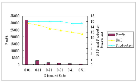- Higher discount rate yields lower accumulated profit and causes lower optimal R&D investments level. It has little effect on the manufacturing investments level;