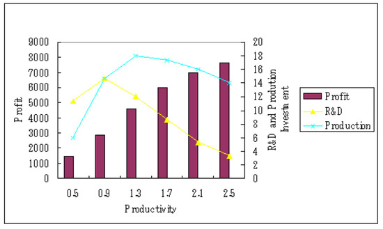Figure 6 demonstrates the result of sensitivity analysis in the leader’s productivity. The result is basically consistent with the expectations. Higher productivity yields higher accumulated profit. Below a certain productivity level (in this case, 0.9 for R&D investments and 1.3 for manufacturing investments), higher productivity causes higher optimal R&D and manufacturing investments. Meanwhile, above the threshold, higher productivity causes lower optimal R&D and production investments. High productivity brings the strong dominant power to the leader. In such a situation, the leader can earn sufficient profit, even in the case of relatively low R&D and manufacturing investments. Thus, higher productivity of the leader provides a negative impact on the new products’ development through the leader’s dominant power. It is interesting that our relatively simple model can handle this monopolistic situation. Note that the leader’s productivity is assumed to be fixed in this model.