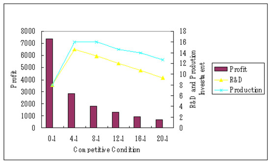 Figure 7 demonstrates the result of sensitivity analysis in the leader’s R&D efficiency. It is basically consistent with the expectations. Higher leader’s R&D efficiency yields higher accumulated profit. Above a certain R&D efficiency level, higher R&D efficiency causes lower optimal R&D and manufacturing investments. Meanwhile, below the threshold, higher R&D efficiency causes higher optimal R&D and manufacturing investments.