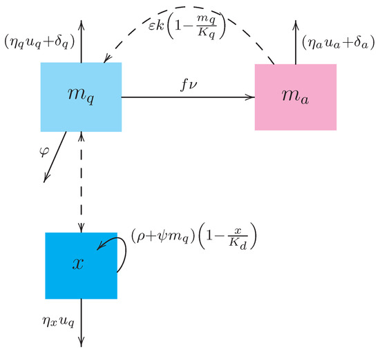 To describe the population growth of A. aegypti mosquitoes in the presence of natural predators of their immature stages, we employ the modeling framework proposed in Reference [20] and amend that model with two exogenous or control variables. Let denote the density of immature stages (eggs, larvae, pupae) effectively present at the moment t in some (ornamental) basin that contains stagnant water and can be viewed as a generic breeding site, and let define the density of female mosquitoes inhabiting the basin surroundings at the moment t. It is worthwhile to recall that urban domestic mosquitoes (such as A. aegypti) are weak flyers and they usually remain within a mean dispersal distance of 30 meters from their birthplace [21]. Therefore, the population size of male mosquitos (which is omitted in the model) is assumed similar to in order to guarantee that all females are able to mate successfully.