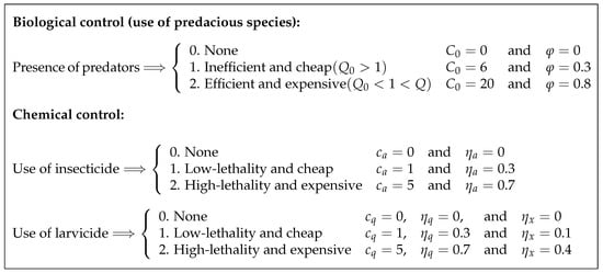 Our goal is to analyze different scenarios, whose determination results from the following considerations. First, there are scenarios where the biological control is either absent () or present (). For the latter, we perform testings with two predacious species—one that is relatively cheap but does not fulfill the condition (5) of predatory efficiency (to be referred further as inefficient or inert predator), and another that fulfills the condition (5) but comes at a higher cost (to be called efficient or aggressive predator in the sequel). The unit cost (i.e., per individual) for both types of predacious species is denoted by . As stated in Reference [13], different larvivorous fish species constitute an example of inefficient or inert predators, while cyclopoid copepods are usually regarded as aggressive and efficient ones.