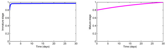 In this context, it is worth recalling that the lethality of existent insecticides and larvicides admits variation between 20% and 80% [44,45,46]; therefore, we suppose 30% efficiency for low-lethality substances and 70% efficiency for high-lethality substances. Such efficiencies are modeled by the parameters (for insecticides) and (for larvicides) in the dynamical system (1), while the underlying (unit) costs of larvicide and insecticide are expressed, respectively, by and in the objective functional (8). Furthermore, we assume that the upper bound of both control functions are normalized to unity: . The latter implies that the daily use of each chemical substance cannot exceed certain quantities and determined externally by the environmental regulations, that is,