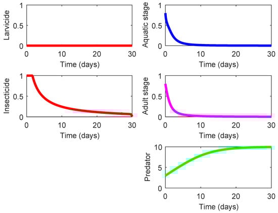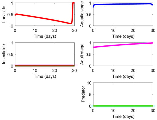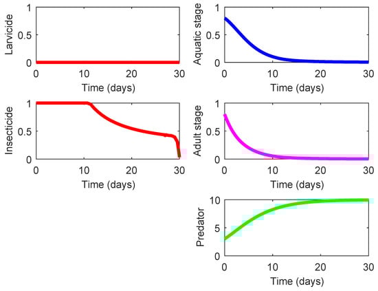 The last three rows in Table 4 display three strategies (Strategies 220, 221, and 222) that demonstrate the highest effect on suppression of the mosquito population and also exhibit a notable eco-effect. Among them, Strategy 220 (consisting in the use of high-lethality insecticide in the presence of efficient predacious species, see Figure 5) possesses a slightly higher of ACER since this strategy does not require the larvicide spraying unlike the other two strategies. As shown in Figure 5, the presence of some efficient predacious specie combined with a moderate spraying of high-lethality insecticide guarantees steady decline of both mosquito population. The results for Strategies 221 and 222 are very similar to those presented in Figure 5, and they are omitted here. The only difference is exhibited by the nonzero control profile according to which the larvicide spraying should by employed (at a moderate mode) during the last couple of days in order to ensure the minimization of the terminal term in the objective functional (8).