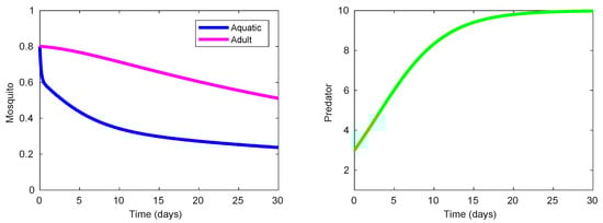 It is worth noting that, for parameter values from Table 2, the basic offspring number defined by (4a) is meaning that one female mosquito produces on average 38 female mosquitoes in the absence of predacious species. This value matches the estimations of the basic offspring number obtained in other studies [41].