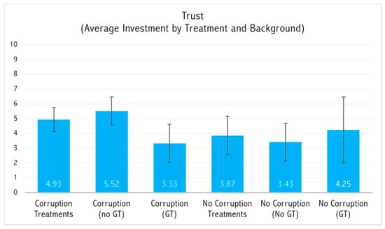 Upon deeper inspection of our data, also using information from our post-experiment questionnaire, we found that 40 trustors declare they have never studied game theory, while 20 declare that they have. If we look at the effect of game theory knowledge on the average trustor’s giving in games with corruption, we find that trustors who declare that they do not know game theory give significantly more (5.52 ECUs, against 3.33 ECUs from those who know game theory) (Figure 4). The non-parametric test on the difference in giving between the two groups of trustors created when using game theory knowledge as a discriminating factor rejects the null (z = 2.34, p-value 0.019 in the two-sided Mann–Whitney rank-sum test).