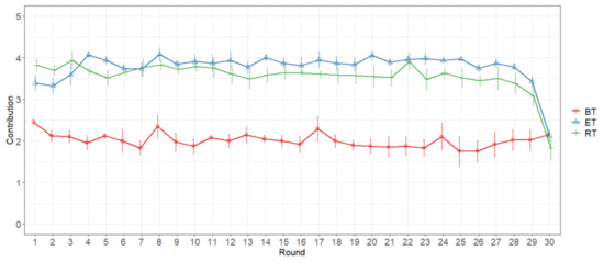 Figure 2 shows the evolution of the average contributions over time in the three treatments. In all but the last round the contributions were lower in BT than in the other treatments. To test for time effects, we compared the sessions’ averages of contributions and earnings of rounds 4 to 13 with those of rounds 20 to 29 for each treatment, excluding the first three rounds, where non-cooperation was not possible, and the last round, where we observed the well-known “end of the experiment effect”. No time effect was observed (Paired t-test: BT: t(2) = 0.64, p = 0.59; RT: t(4) = 1.80, p = 0.15; ET: t(4) = 0.40, p = 0.71).