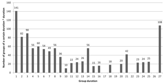 Hypothesis 2 was instead rejected by the data. Table 2 as well as Figure 2 reveal that there is no significant difference in average contributions and average earnings between RT and ET. Furthermore, average cooperation rates (calculated as the number of times a receiver or a distributor has cooperated, averaged by session) in RT and ET are indistinguishable (two sample t test: t(6.04) = 0, p = 1). However, within the ET treatment we observe substantial differences in the endogenous life span of groups. In Figure 3, we plot the number of groups with their duration, weighted by the duration of the group. (Weighting by the duration of the group is necessary to avoid misleading results. To see this, take a hypothetical session with 16 subjects and 27 rounds. In this session, half of the subjects stay always in the same group (i.e., two completely stable groups), while the other groups never cooperate and hence always split after one round. In this case we have 2 groups with a duration of 27 rounds each, and 54 groups with a duration of 1. Taking only the number of groups with the different durations would give the impression as if groups of duration 1 would completely dominate the session, while in fact the actual distribution of subjects into the short- and the long-term groups is half/half.) Since during the first three rounds groups had to cooperate, we take only rounds 4 to 30 into account, implying that the minimum group duration is 1 and the maximum 27. As can be seen from this figure, 141 groups broke up immediately since in these cases at least one member of the group refused to cooperate already at the first round the group was together (groups of duration 1). A total of 41 groups cooperated once and refused cooperation in the second round of their existence (duration of 2), 30 groups cooperated twice and refused cooperation in the third round of their existence (duration of 3), etc. Recall that during these rounds a refusal to cooperate ends the group relationship and the members get randomly re-matched in the next round (unless they were already in round 30). For example, if a group was matched in round 15, cooperated from round 15 to round 17, and at least one member refused to cooperate in round 18, the group duration in that span is 4 rounds.