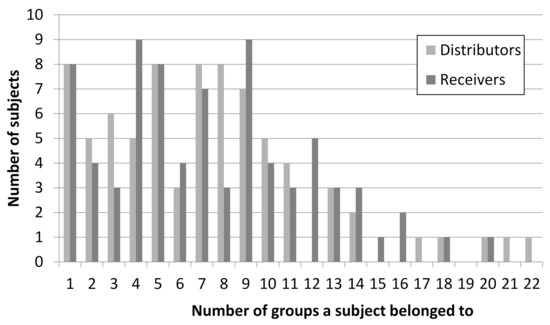 Overall, Figure 3 reveals a large heterogeneity of group durations, with a lot of short-lived groups, but also quite some long-term relationships. These differences in group duration translated into substantial differences in the number of groups subjects belonged to. To see this, we calculated for each subject the number of groups she or he belonged to during the whole experiment (again excluding the first three rounds). e.g., if a subject spent 26 rounds with the same group and 1 round with another group, the number of groups she belonged to is 2. The same results if a subject spent 13 rounds with a group and the remaining 14 rounds with another group. Figure 4 shows the distribution of numbers of groups subjects belonged to. Eight distributors and eight receivers were only members of one group, i.e., four groups (out of 39 possible) stayed together for the whole experiment. On the other hand, many subjects switched group quite often (e.g., eight distributors and seven receivers belonged to seven groups), and a few subjects even belonged to more than 20 groups.