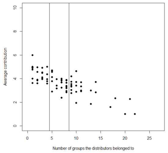 Average contribution of individual distributors, given the number of groups she belonged to. The vertical lines divide distributors into three sub-groups of roughly equal size: “few-group distributors”, i.e., distributors belonging to 4 groups or less (24 distributors), “multi-group distributors” belonging to 9 groups or more (27 distributors), and “some-group distributors” belonging to a medium number of different groups (27 distributors).