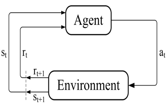 Game theory presents a set of mathematical equations to analyze the background in decentralized control issues. A game is usually formed by a set of agents (players) with the same population behavior that select a strategy to perform an action. The strategy of an agent allows it to maximize rewards in cases where the action selected was appropriate or may result in punishment if it was not [26]. This behavior is analyzed using theory of learning. In this context, the reinforcement learning (RL) scheme gives the main features to understand the direct relationship between signals, actions, states, and the environment. At each step of their interaction, each player receives a notification of the present environment state and a reinforcement signal, and consequently, it selects a strategy. Each player of the game has the purpose of finding a policy that provides him the best profits after mapping states to actions [27]. Figure 1 shows the RL framework, where an agent at time t takes an action depending on the information perceived in the environment state . Then, the environment changes to state and, consequently, the agent perceives a consequence of its taken actions , e.g., reward or punishment.