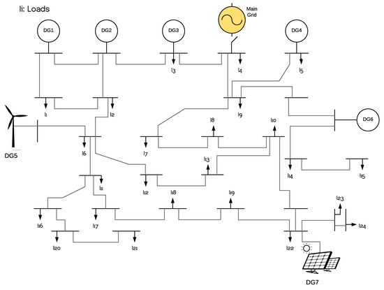 The authors in [39] proposed two control levels. In the lower levels a controllable voltage source of distributed generators (DGs) is connected to loads with an inverter. The output voltage frequency and magnitude are controlled by a droop-gain controller [17]. Figure 4 shows the general microgrid distribution composed of seven DGs.