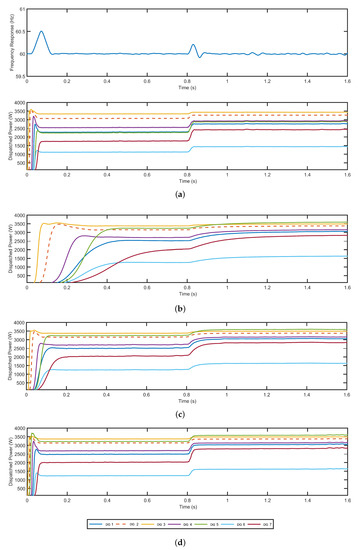Results for a microgrid test system. (a) Frequency response and active power response of DGs for the classic RD. The evaluation of the behavior of the Boltzmann-based distributed replicator dynamics is shown for different values of as follows: (b) (c) , (d) .