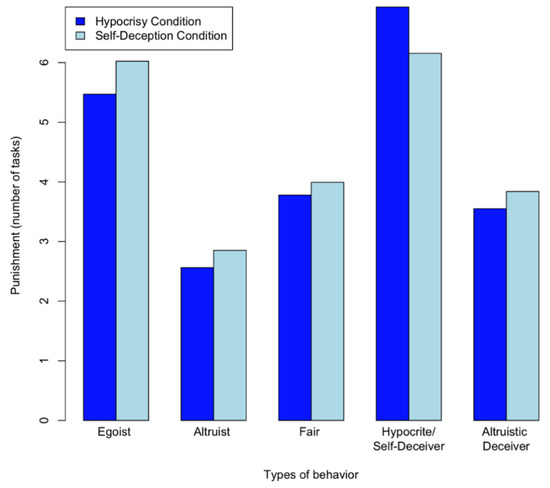 Post hoc tests (see Table 2) revealed that hypocrisy was punished more strongly than all other types of behavior in the hypocrisy condition. In particular, hypocrisy was punished more rigidly than open egoism. Open egoism and self-deception, however, did not receive significantly different punishments in the self-deception condition.