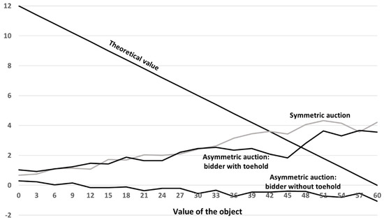 Figure 1 presents the theoretically predicted and average observed bid premiums as a function of the object’s value . Note that the theoretical bid premium does not depend on the other bidder’s toehold, and, for the bidder without a toehold, it is equal to zero.