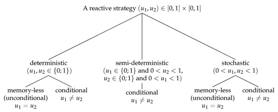 | Repeated | Stochastic and unconditional RSs | The repeated modification of where probabilities of actions can be conditioned by the preceding opponent’s action. In addition to memory-less strategies from , players get conditional ones. |