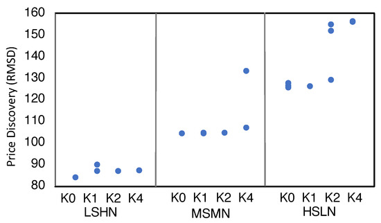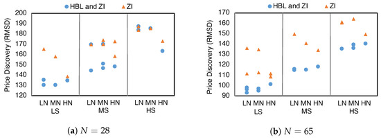 Overall, background traders achieve higher surplus (Figure 4) and better price discovery (Figure 5) when the market provides order book information and enables the HBL strategy option. When HBL exists in the equilibrium, we find transactions reveal fundamental estimates well, especially in markets with lower shock and observation variances (i.e., LSLN, LSMN, MSLN and MSMN). We also notice small exceptions in scenarios with high observation variance and more background traders (environments LSHN and HSHN with 65 players) where ZI-only equilibria exhibit higher surplus than equilibria combining HBL and ZI.