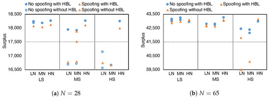 Figure 3 (blue circles) depicts the proportion of background traders who choose trading strategies in the HBL family. In most non-spoofing environments, HBL is adopted with positive probability, suggesting that investors generally have incentives to make bidding decisions based on order book information. We find that HBL is robust and widely preferred in markets with more traders, low fundamental shocks and high observation noise. Intuitively, a larger population size implies a thick order book with more learnable aggregated data; low shocks in fundamental time series increase the predictability of future price outcomes; and high observation noise limits what an agent can glean about the true fundamental from its own information. This is further confirmed in the two exceptions where all agents choose ZI: HSLN and HSMN with , the environments with fewer traders, high fundamental shocks and at most medium observation noise.
