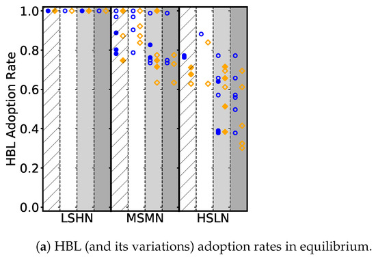 HBL adoption rates at equilibria in games with and without spoofing. Each blue (orange) marker specifies the HBL proportion at one equilibrium found in a specific game environment without (with) spoofing.