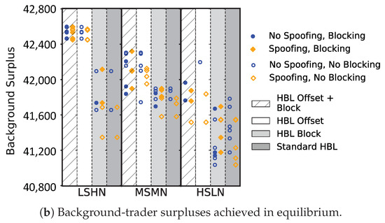 Since spoofing targets the order book and can be effective only to the extent traders exploit order book information, we investigate whether background agents adopt the HBL strategy in markets without spoofing. Applying EGTA to the eleven background strategies in Table 1, we found at least one equilibrium for each market environment. Detailed results on equilibrium mixture and outcomes of games without spoofing can be found in Appendix A.2.