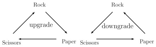 The coded cyclic strategies of upgrade (left) and downgrade (right) that represent consecutive choices. Upgrade refers to the subsequent th choice that beats the previous tth choice (e.g., rock-paper) and downgrade refers to the subsequent th choice that is beaten by the previous tth choice (e.g., paper-rock), based on each player’s self choice.