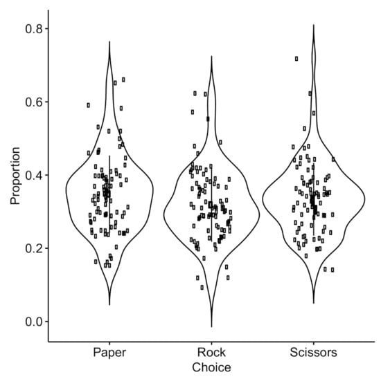 In a more applied scenario, Batzilis et al. [9] analyzed players’ actions from a large online RPS game dataset. They reported that players strategically used the information on their opponents’ previous play. As a result, players with more experience used information about their opponents more effectively than less-experienced players and, thus, were more likely to win. Cook et al. [14] observed another possibility of knowing the opponents’ throws—players tended to imitate their opponents. They found a higher frequency of draws when one player could see the other, compared to when both players were blindfolded.